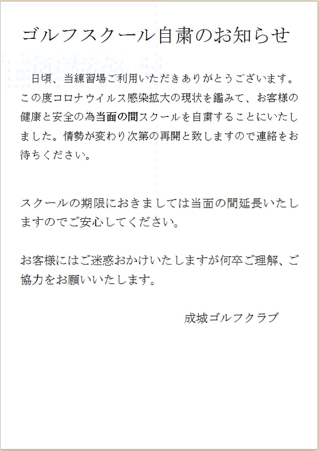ゴルフスクール自粛のお知らせ