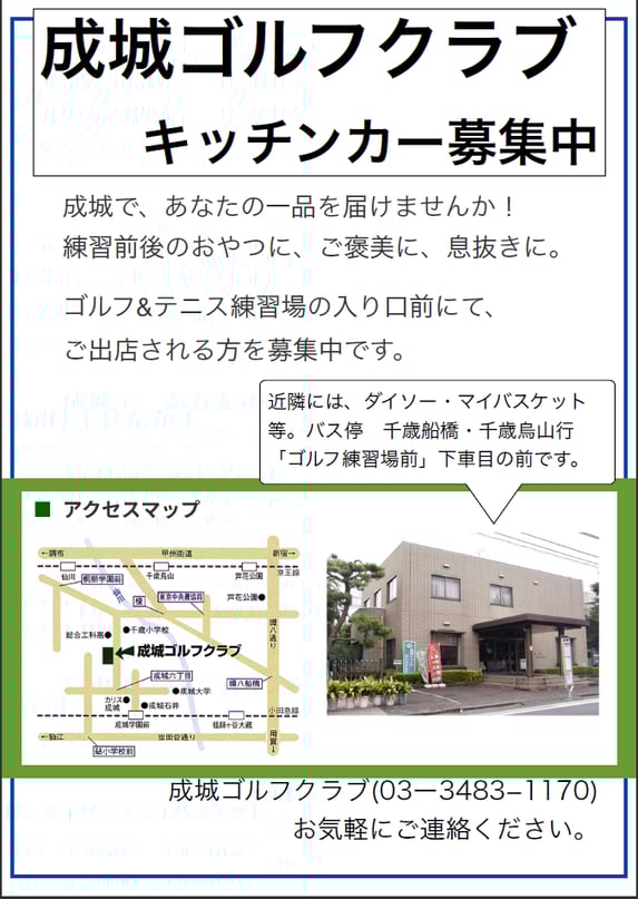 成城で、あなたの一品を届けませんか! 練習前後のおやつに、ご褒美に、息抜きに。 ゴルフ&テニス練習場の入り口前にて、ご出店される方を募集中です。